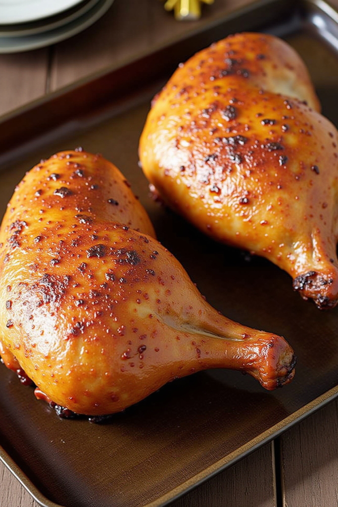 2. Grill the Turkey: Place turkey pieces (and ham, if using) skin side down on the grill. Cover and cook for 25–35 minutes, turning occasionally, until internal temp reaches 165°F. Rest for 10 minutes before slicing.